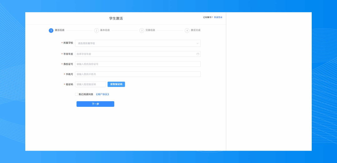 进入”激活页面”后填写正确的信息,输入正确的个人信息和手机号,以获取验证码。
