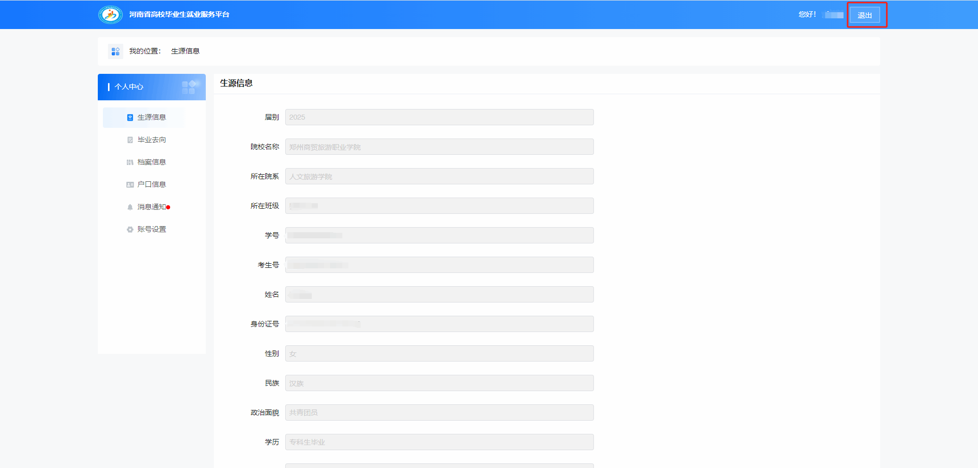 在系统右上角点击”退出”,即可完成安全退出, 出于对数据安全考虑,在不使用系统时请务必点击退出按钮退出,不要直接关闭浏览器窗口