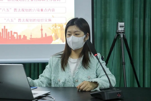 杨静老师从三个方面为大家全面解读了关于开展法治宣传教育的第八个五年规划(2021—2025年)。一是主要目标和工作原则。要以习近平法治思想引领全民普法工作,到2025年,公民法治素养和社会治理法治化水平显著提升,全民普法工作体系更加健全;二是规划的六项重点内容。主要概括为六项重点内容,三项新举措,三个新要求;三是规划的组织实施。要切实加强组织领导、全面落实普法责任制、不断强化基层基础、切实加强评估检查。