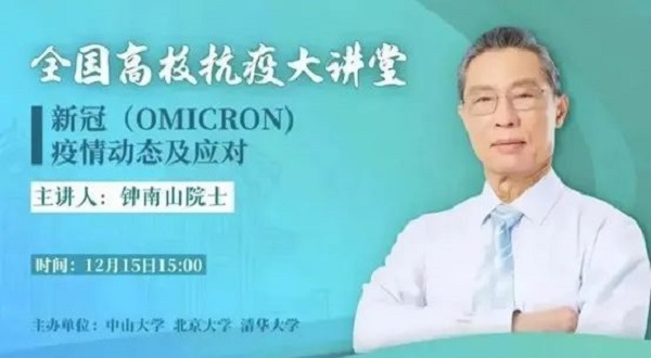 为筑牢师生疫情防控思想防线,科学有效地开展疫情防控工作,12月15日,我校组织全体师生观看由中山大学、北京大学、清华大学主办,钟南山院士主讲的全国高校抗疫大讲堂:新冠(Omicron)疫情动态及应对线上直播。