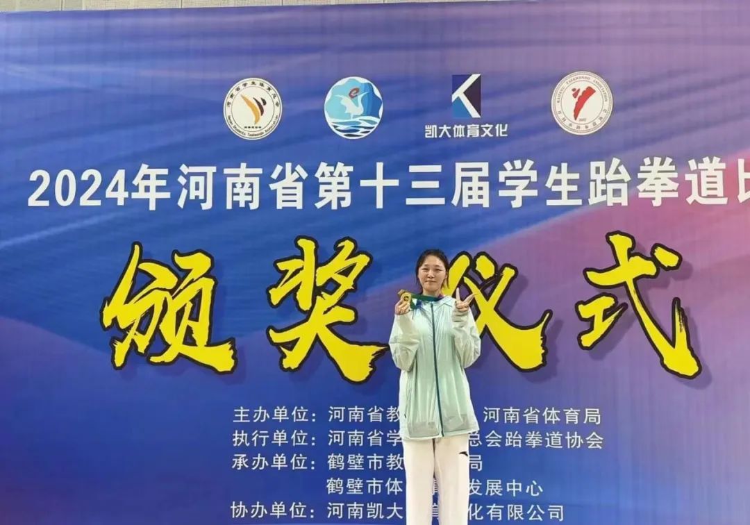 7月13日至7月18日,由河南省教育厅、河南省体育局主办的“河南省第十三届学生跆拳道比赛”,在鹤壁市千鹤之舞体育馆隆重举行。我校人文旅游学院2022级社会体育专业学生燕雨涵沉着应战,积极拼搏,经过激烈角逐后,获得跆拳道竞技比赛女子67kg级冠军。