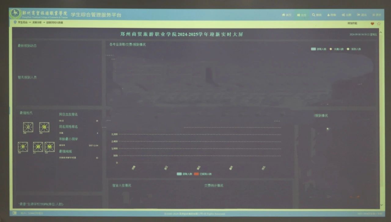 为掌握新生报到动态数据,学校采用线上迎新系统,设置了迎新实时大屏,时刻掌握新生报到情况。