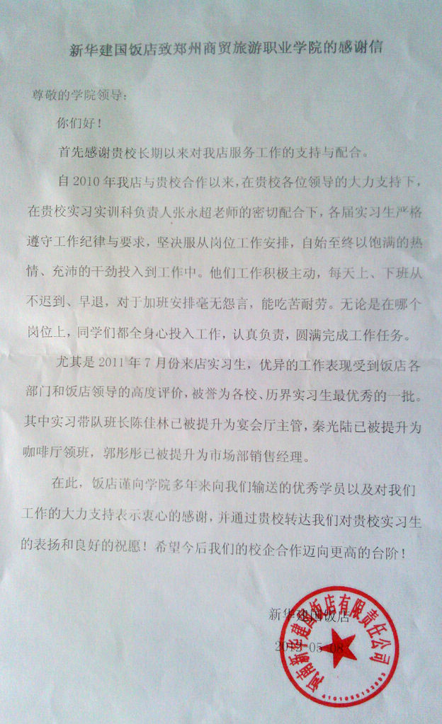 在此,饭店谨向学院多年来向我们输送的优秀学员以及对我们工作的大力支持表示衷心的感谢,并通过贵校转达我们对贵校实习生的表扬和良好的祝愿!希望今后我们的校企合作迈向更高的台阶!