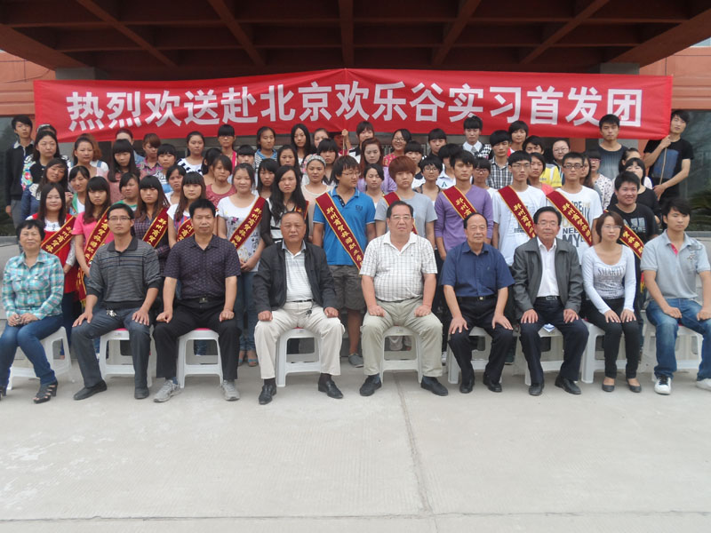 2013年9月22日下午,我院在学院行政办公楼前举行了赴北京欢乐谷实习就业仪式,这是我系首批学生集中赴北京欢乐谷实习就业,11级旅游管理专业同学,由院长助理张寸花带队。学院席青慧董事长、党委郭林山书记、执行院长宋述奎、就业指导办公室王素湘主任、教务处姜海东处长、学生处王保惠处长、图书馆葛阔先馆长以及辅导员和部分老师为同学们送行。