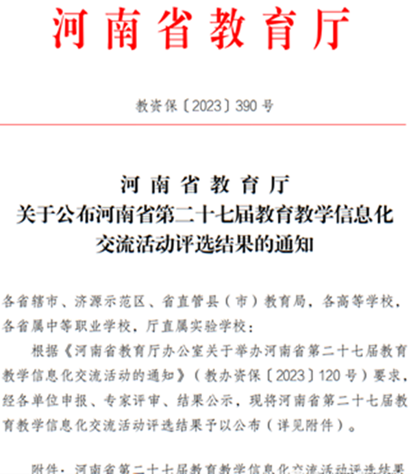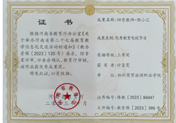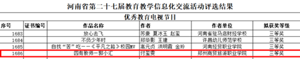 近日,河南省教育厅公布了第二十七届教育教学信息化交流活动评选结果,我校教师付玺雯参赛的视频作品《四有教师——郭小汇》荣获优秀教育电视节目类三等奖,充分展示了我校教师扎实的教学功底和过硬的信息技术应用能力。