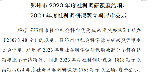 郑州市社科联下发《2023年度社科调研课题结项、2024年度社科调研课题立项评审公示》,我校原燕燕、马冰洁等老师主持的7项课题拟获批立项;马小伟等老师主持的3项课题顺利拟结项。