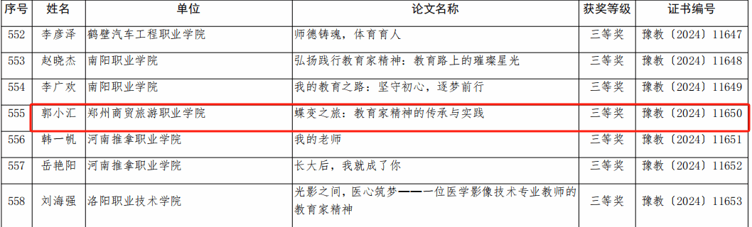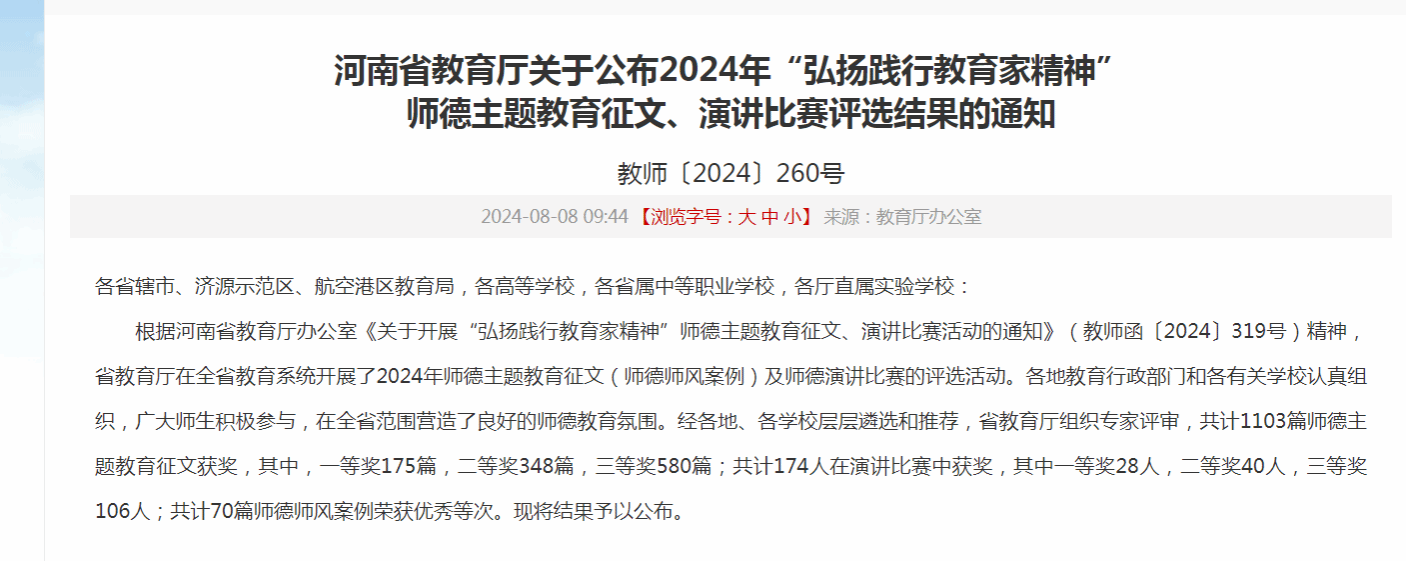 近日,河南省教育厅发布2024年“弘扬践行教育家精神”师德主题教育征文、演讲比赛评选结果的通知(教师〔2024〕260号),我校在此次主题教育征文评选中喜获佳绩,郭小汇老师撰写的《蝶变之旅:教育家精神的传承与实践》获得三等奖。