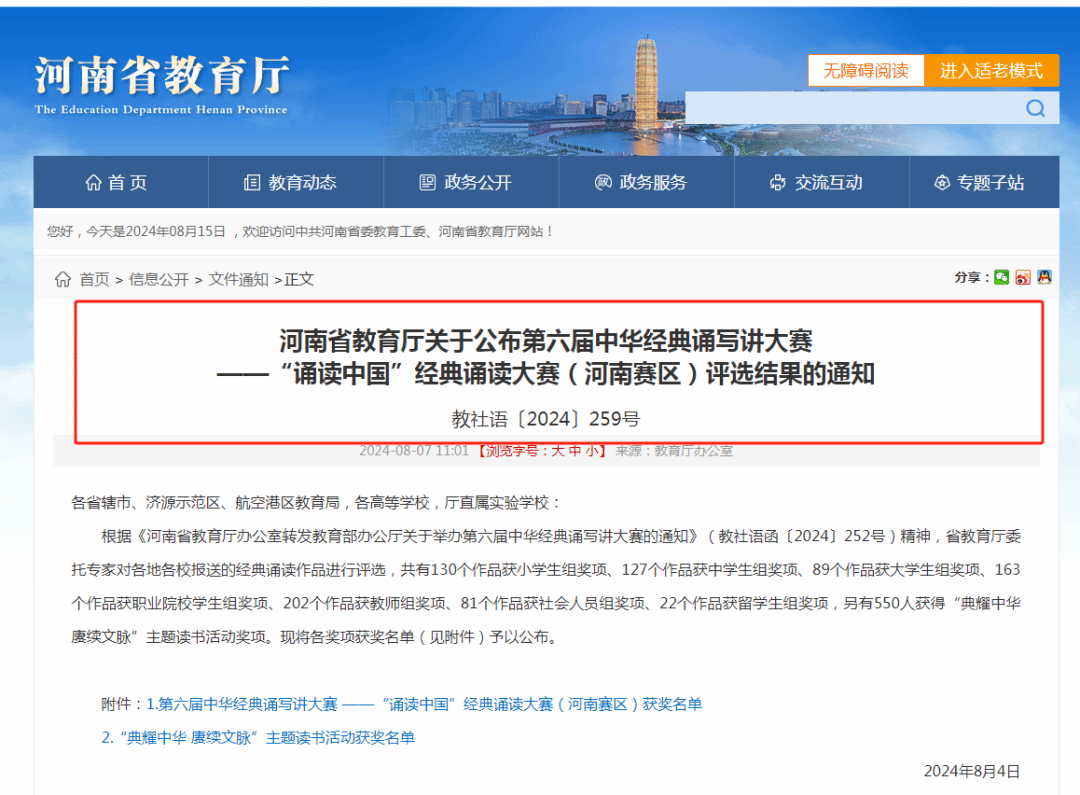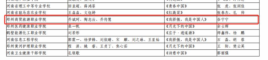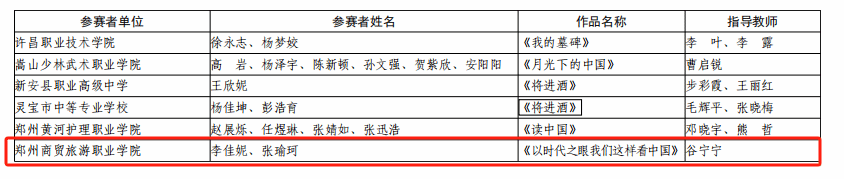 近日,河南省教育厅公布了第六届中华经典诵写讲大赛---“诵读中国”经典诵读大赛(河南赛区)评选结果,本次大赛中我校学生乔斌珂、陶志汝、乔传慧的作品《我骄傲,我是中国人》和李佳妮、张瑜珂的作品《以时代之眼我们这样看中国》荣获三等奖。