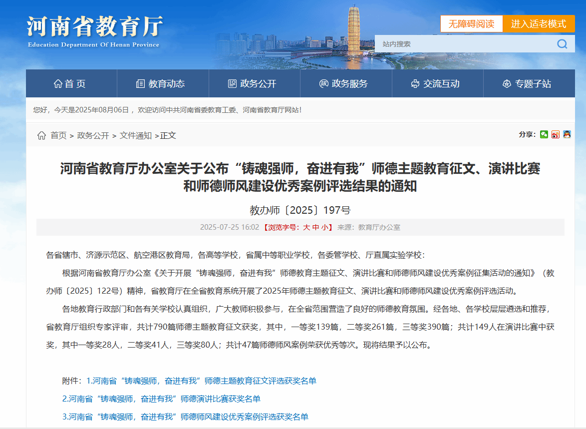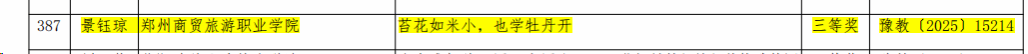 近日,在河南省教育厅办公室印发的《关于公布“铸魂强师,奋进有我”师德主题教育征文、演讲比赛和师德师风建设优秀案例评选结果的通知》教办师〔2025〕197号文件中,我校财经商贸学院景钰琼老师的征文作品《苔花如米小,也学牡丹开》脱颖而出,荣获三等奖。