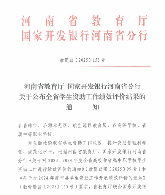 近日,河南省教育厅、国家开发银行河南省分行联合印发了《关于发布全省学生资助工作绩效考核评价结果的通知》(教资助〔2025〕158号)文件,公布了全省高校学生资助绩效评价结果,本次绩效评价结果分为优秀、良好、合格、不合格四个等次,在参与评价的173所高校中,我校获评“良好”等次。这一评价结果意义深远,是对我校学生资助工作成效的高度肯定。