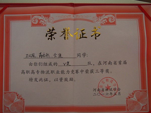 恭喜我院15级物流管理专业学生,参加河南省首届高职高专物流职业能力竞赛,双双获奖。