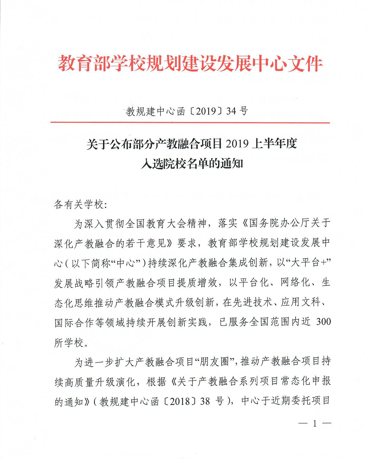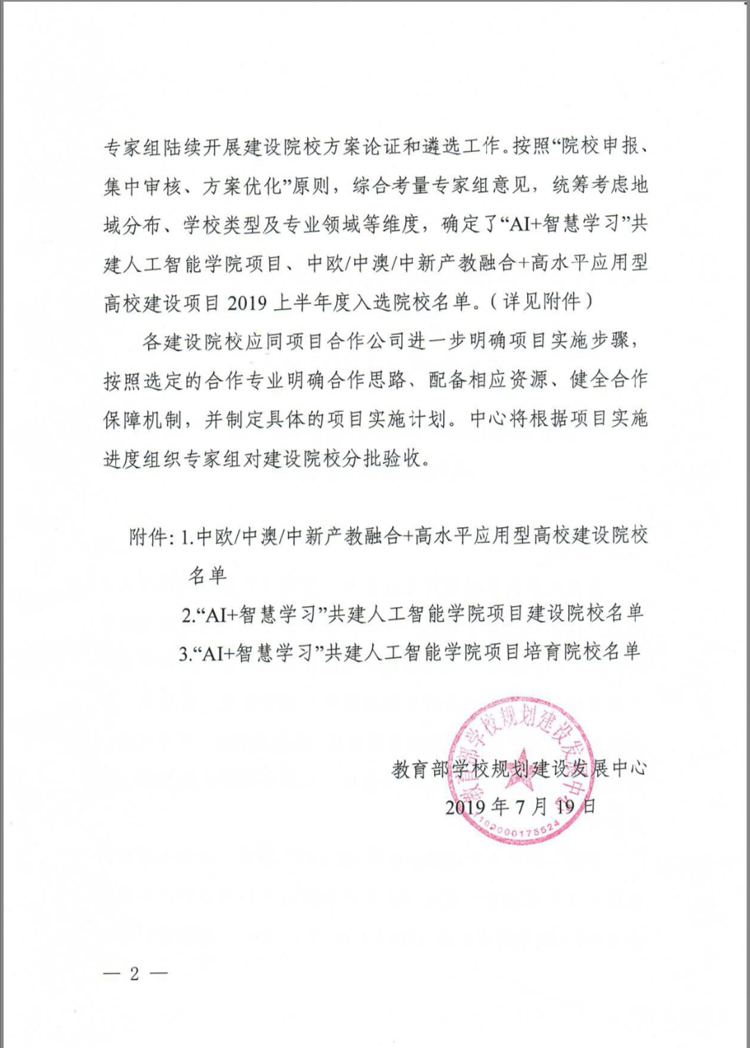 7月19日,教育部学校规划建设发展中心发布《关于公布部分产教融合项目2019上半年度入选院校名单的通知》(教规建中心函[2019]34号),确定郑州商贸旅游职业学院等10所高校入选“AI+智慧学习”共建人工智能学院项目。