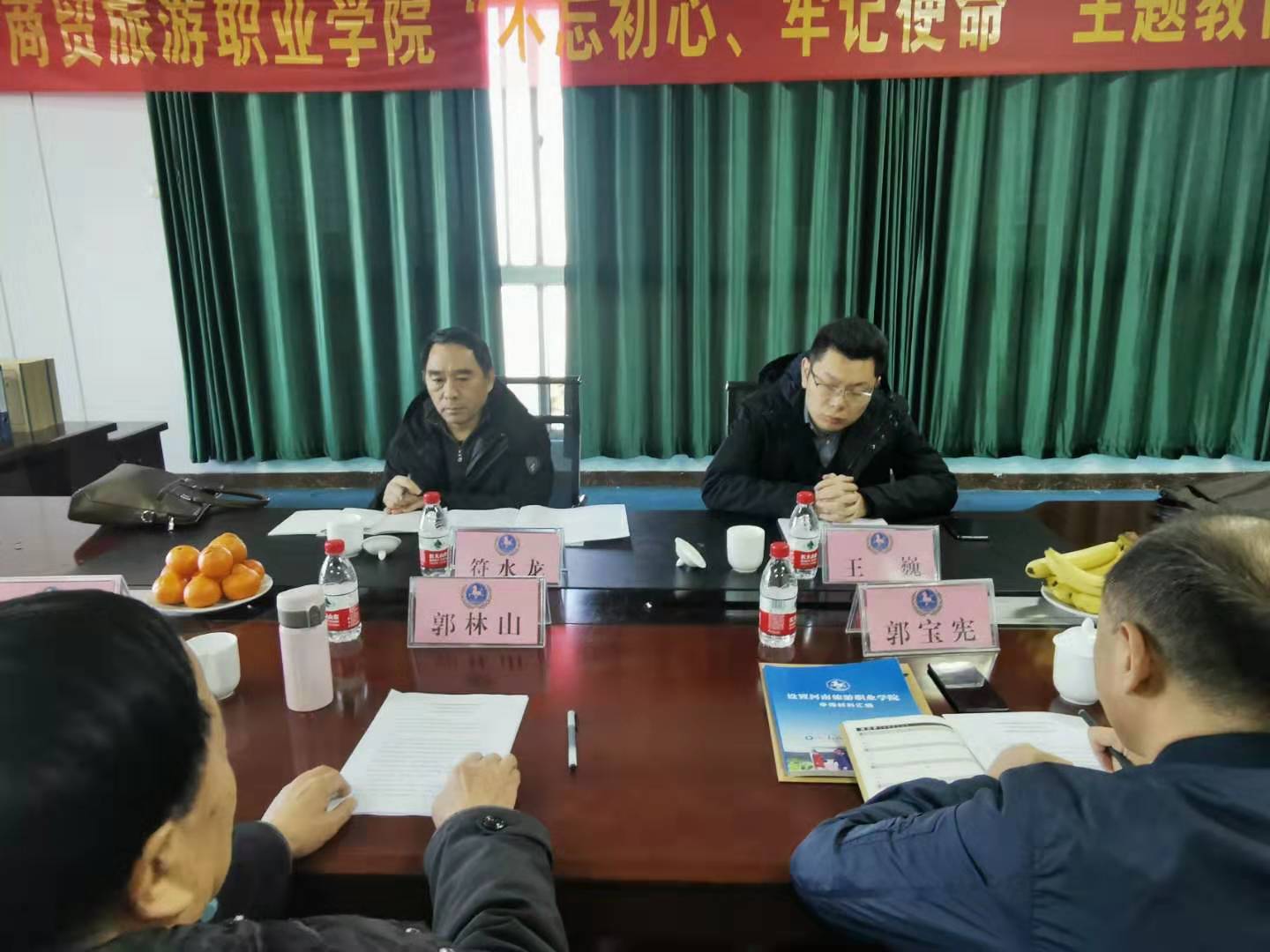 2019年12月3日上午10点,中共郑州商贸旅游职业学院委员会在图书馆四楼会议室召开党委民主生活会。省高校工委第一巡回指导组符水龙书记、王巍主任一行两人到学院列席指导会议。出席会议的有学院党委书记郭林山、党委副书记郭宝宪、副院长(学生处党总支书记兼)刘华强、副院长(教务处党支部书记兼)巴玉强。