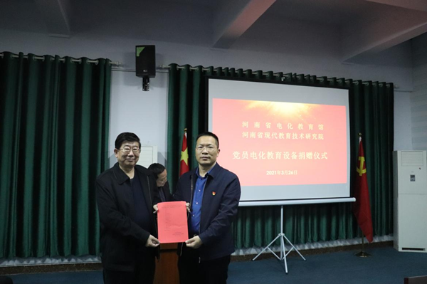 随后,河南省电化教育馆馆长史先进代表河南省电化教育馆和河南省现代教育技术研究院向郑州商贸旅游职业学院党员教育室捐赠了两套价值二十余万元的党员电化教育设备。活动仪式结束后,在院领导的陪同下,省电教馆领导班子还参观考察了学生实习基地和创业就业平台。参加活动仪式的有河南省电化教育馆馆长史先进、副馆长窦颖梅、孙家栋、刘新超,办公室主任崔海生。学院出席人员有董事长席青慧、党委书记李普涛、党委副书记郭林山、副院长巴玉强、副院长王素湘、教务处长张明强以及部分在校骨干教师。活动仪式由郑州商贸旅游职业学院党委副书记郭林山主持。(通讯员:滕思远)