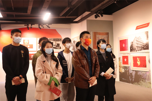 为庆祝中国共产党成立100周年,全面深入学习习近平总书记“七一”重要讲话精神,进一步推动党史学习教育走深走实,根据河南省党史学习教育领导小组办公室有关要求,11月5日上午,我校部分师生党员在学校党委副书记张海斌的带领下来到郑州升达艺术馆,参观了“旗帜飘扬——党旗国旗军旗诞生珍贵史料展”。