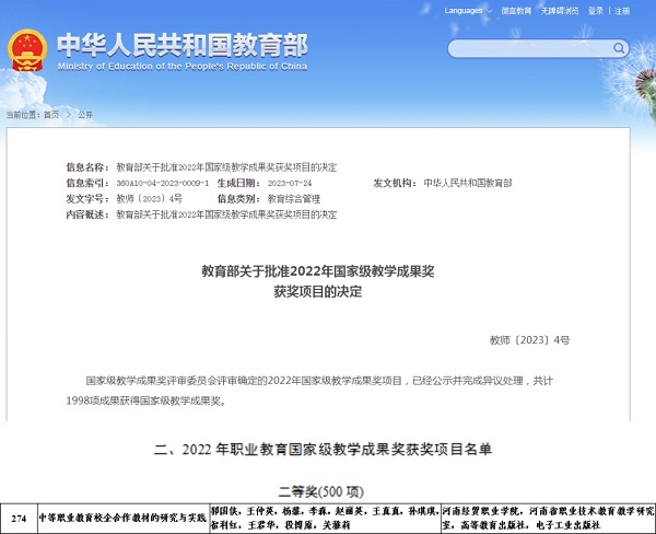 近日,教育部发布了《教育部关于批准2022年国家级教学成果奖获奖项目的决定》(教师〔2023〕4号)。我校郭国侠校长主持的教学成果《中等职业教育校企合作教材的研究与实践》喜获职业教育国家级教学成果奖二等奖。