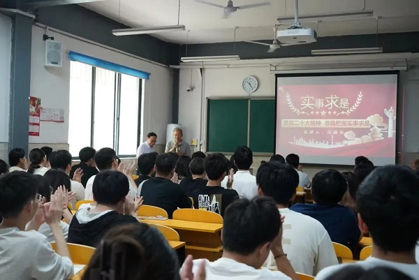 副校长冯鑫永教授以《贯彻党的二十大精神,准确把握实事求是》为主题,从实事求是的内涵、实事求是的要求、实事求是的重要性、新时代如何坚持实事求是等方面进行讲解。副校长冯鑫永教授讲课中,生动运用了“孔子东游”、“指鹿为马”、“皇帝的新衣”等故事揭示实事求是的本质,并结合党的遵义会议、十一届三中全会深刻解答实事求是的重要性,重点解析《反对本本主义》、《高举毛泽东思想旗帜,坚持实事求是的原则》、《正确认识改革开放前和改革开放后两个历史时期》中关于实事求是的重要论述,告诫同学们应实事求是的学习党的历史,坚持“打铁还需自身硬”的精神,踏踏实实学习。