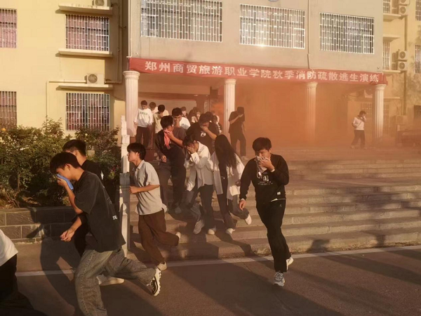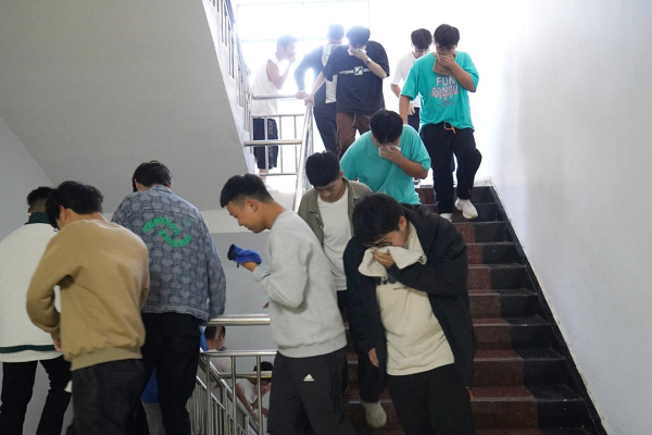 专题讲座结束后,随着警铃响起,新密校区消防安全演练正式开始。在模拟烟雾的笼罩中,各楼层辅导员有条不紊,分工合作,井然有序的指挥学生按照顺序从就近楼道快速撤离到楼外。在疏散指挥组做完疏散工作后,搜救组再次对宿舍楼进行了排查搜索,确保各个楼层的人员都已安全撤离。