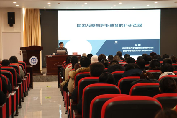 12月28日上午,北京师范大学国家职业教育研究院院长、教授、博士生导师和震莅临我校举办学术讲座,题目是“国家战略与职业教育的科研选题”。本次学术讲座由校长郭国侠主持,副校长冯鑫永、王素湘出席学术讲座,河南工业贸易职业学院党委副书记柴瑞帅、河南大学王为民博士等8位省内职教专家及我校300余名师生代表参加此次学术讲座。