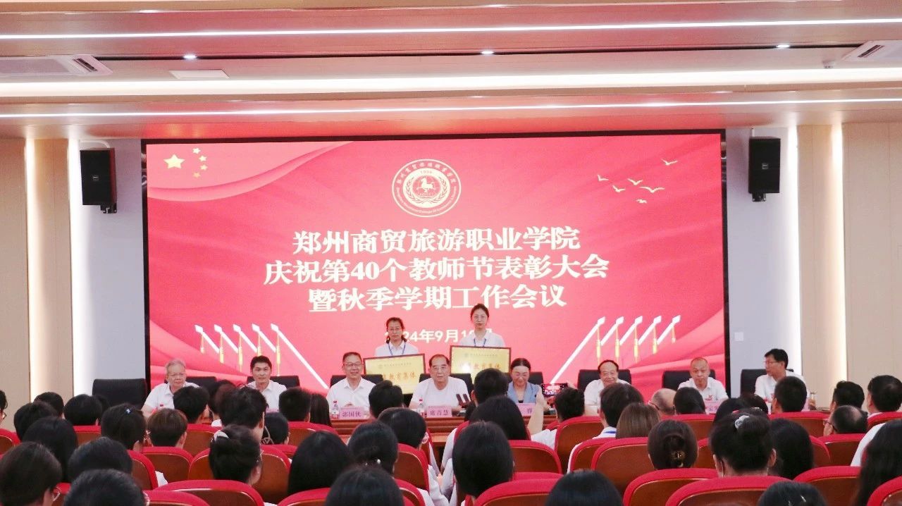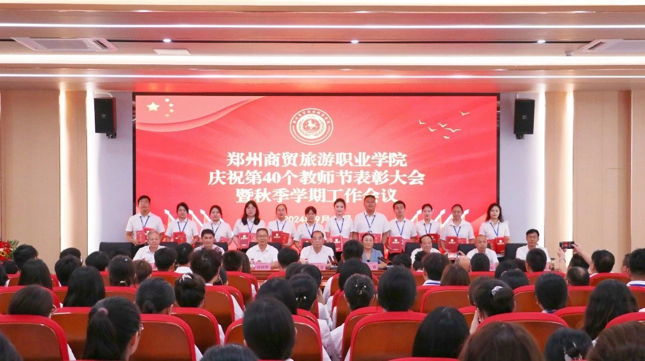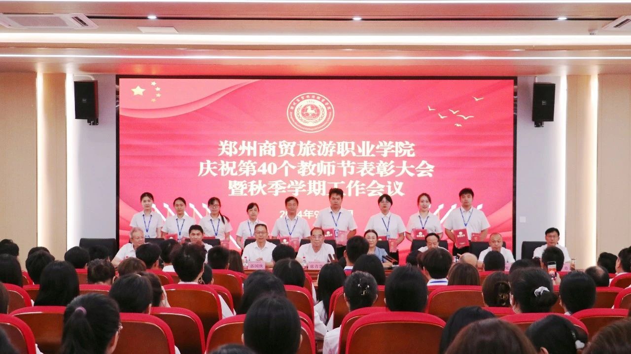 副校长冯鑫永宣读了《郑州商贸旅游职业学院关于对2024年教师节优秀个人和集体进行表彰的决定》,校领导们分别为优秀教师、优秀辅导员、优秀教育工作者、特别贡献奖、优秀教育集体颁奖。