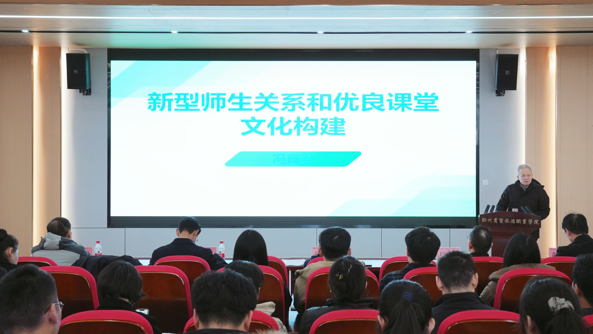 冯校长指出,师生关系是一个重要的社会关系,拥有良好、和谐的师生关系是好学校、好老师的重要指标。冯校长通过讲解对比专制型师生关系、平等型师生关系等古今中外师生关系的优劣势,提出要建立以“尊师爱生、民主平等、教学相长、心理相容”为特征的新型师生关系。冯校长认为“教改深处是课改,课改深处是课堂,课堂深处是文化”,他强调构建优良的课堂文化,教师要转换角色,要潜移默化影响学生,要让课堂变得有趣,要改革创新教学方式。冯校长勉励我校教职工在教学过程中需做到课堂有精神、有意义、有效率、有智慧、有温度和有引导,对待学生要谦和平易、长善救失、严管厚爱。