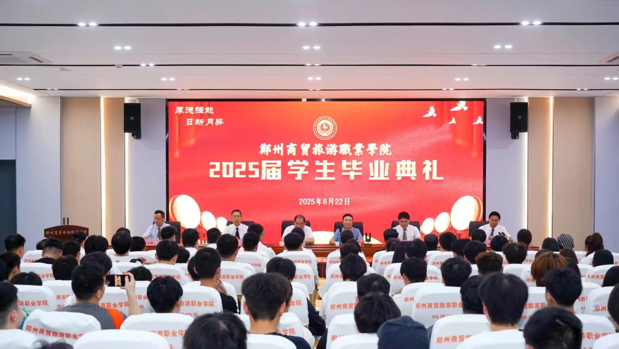 党委书记张睿宣布 “郑州商贸旅游职业学院2025届学生毕业典礼正式开始”。典礼在庄严的国歌声中正式开幕,全体起立,奏唱国歌。