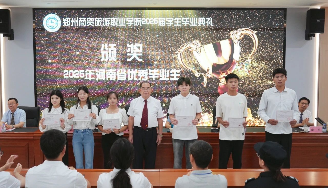 党委副书记焦永刚宣读了《河南省教育厅办公室关于公布2025届河南省优秀大中专毕业生认定结果的通知》《郑州商贸旅游职业学院关于表彰2025届校级优秀毕业生的决定》。
