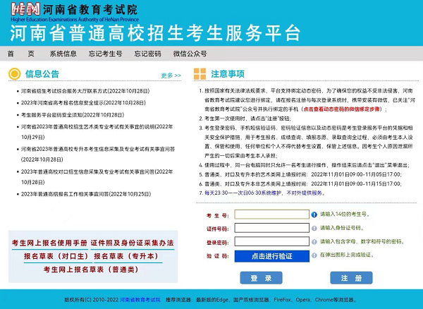 进入考生服务平台后,请仔细阅读''信息公告''区、''注意事项''区发布的政策公告和注意事项。