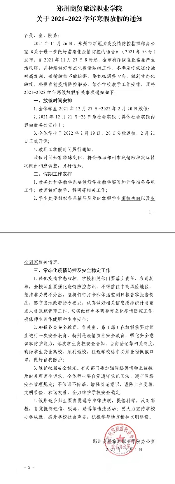 郑州商贸旅游职业学院关于2021-2022学年寒假放假的通知