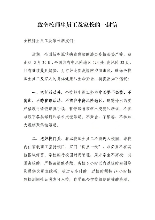 致全校师生员工及家长的一封信