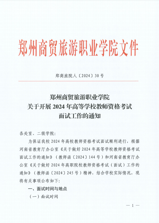 郑州商贸旅游职业学院关于开展2024年高等学校教师资格考试面试工作的通知