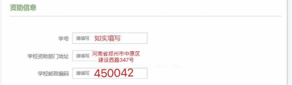 2.学校资助部门地址统一填写为:河南省郑州市中原区建设西路347号