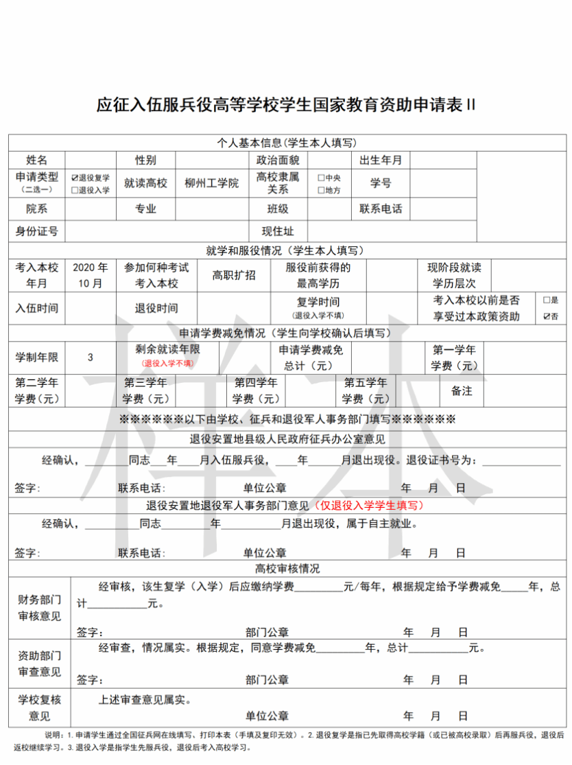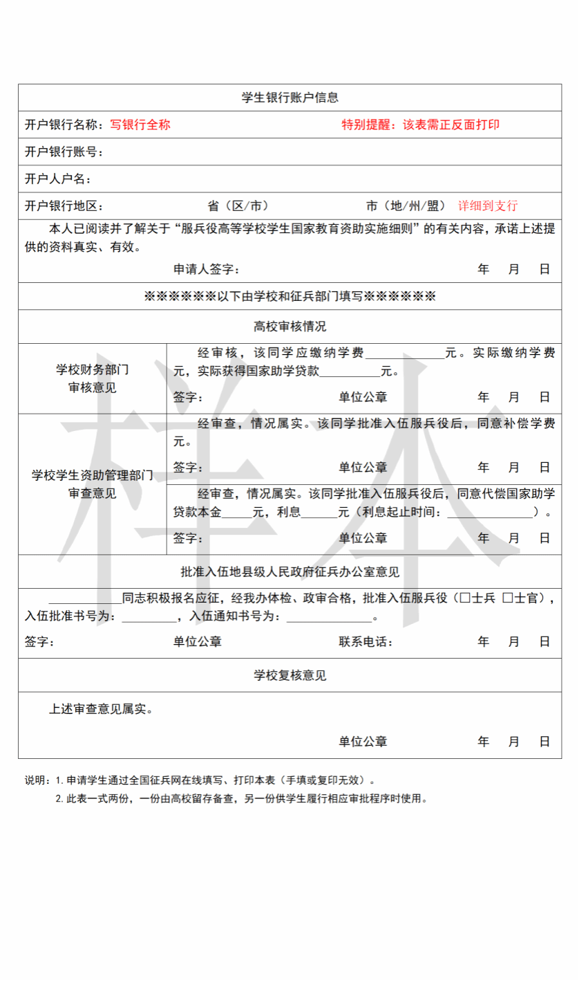 2.《应征入伍服兵役高等学校学生国家教育资助申请表Ⅰ》、《应征入伍服兵役高等学校学生国家教育资助申请表Ⅱ》必须全国征兵网上在线填写打印,手写、复印无效;