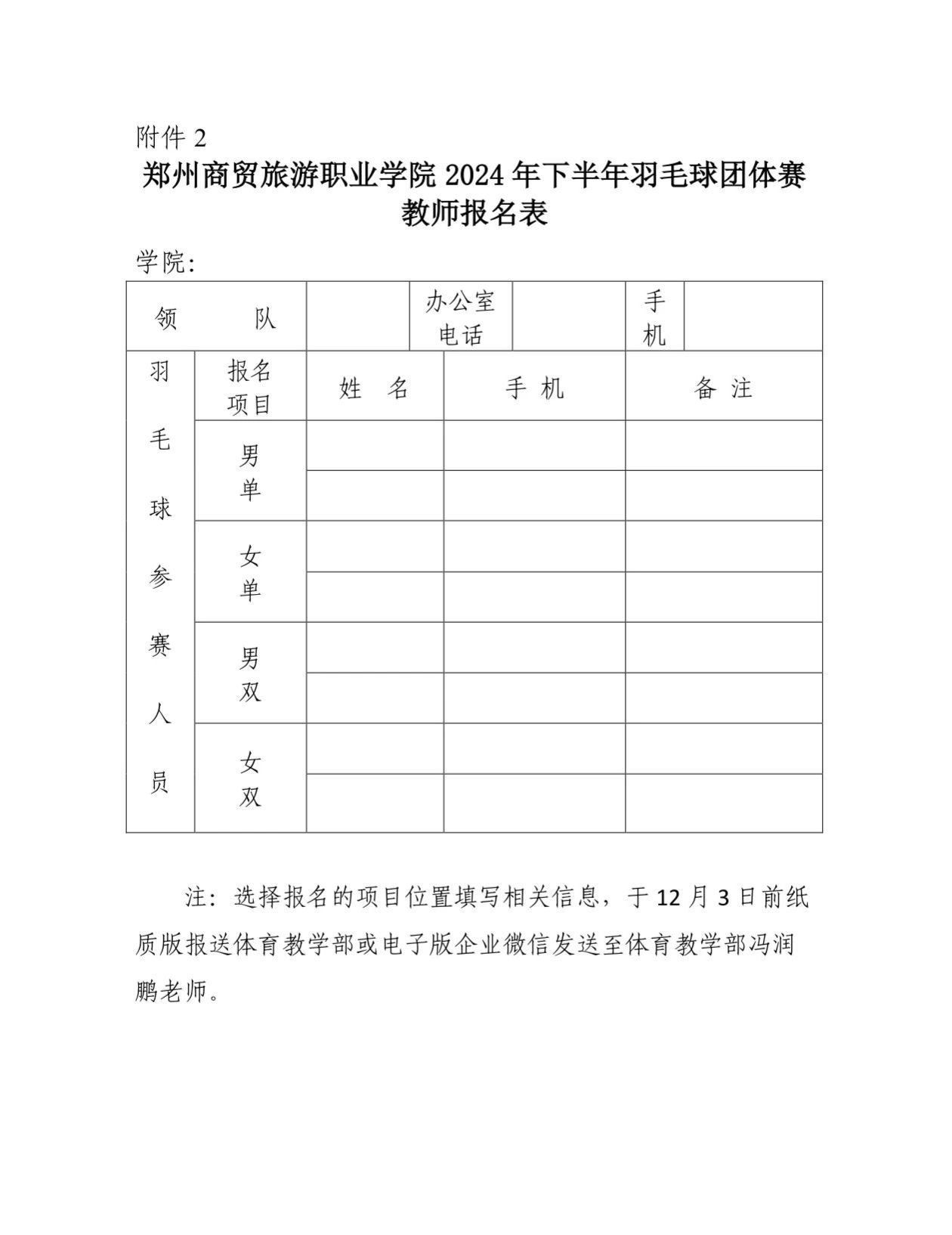 教师参赛队:教师自愿参加2024年郑州商贸旅游职业学院羽毛球赛的男单、女单、男双、女双,填写《郑州商贸旅游职业学院2024年羽毛球教师赛报名表》后报送至体育教学部。比赛采用单败淘汰赛模式,各单项参赛队≤4则单项取消。