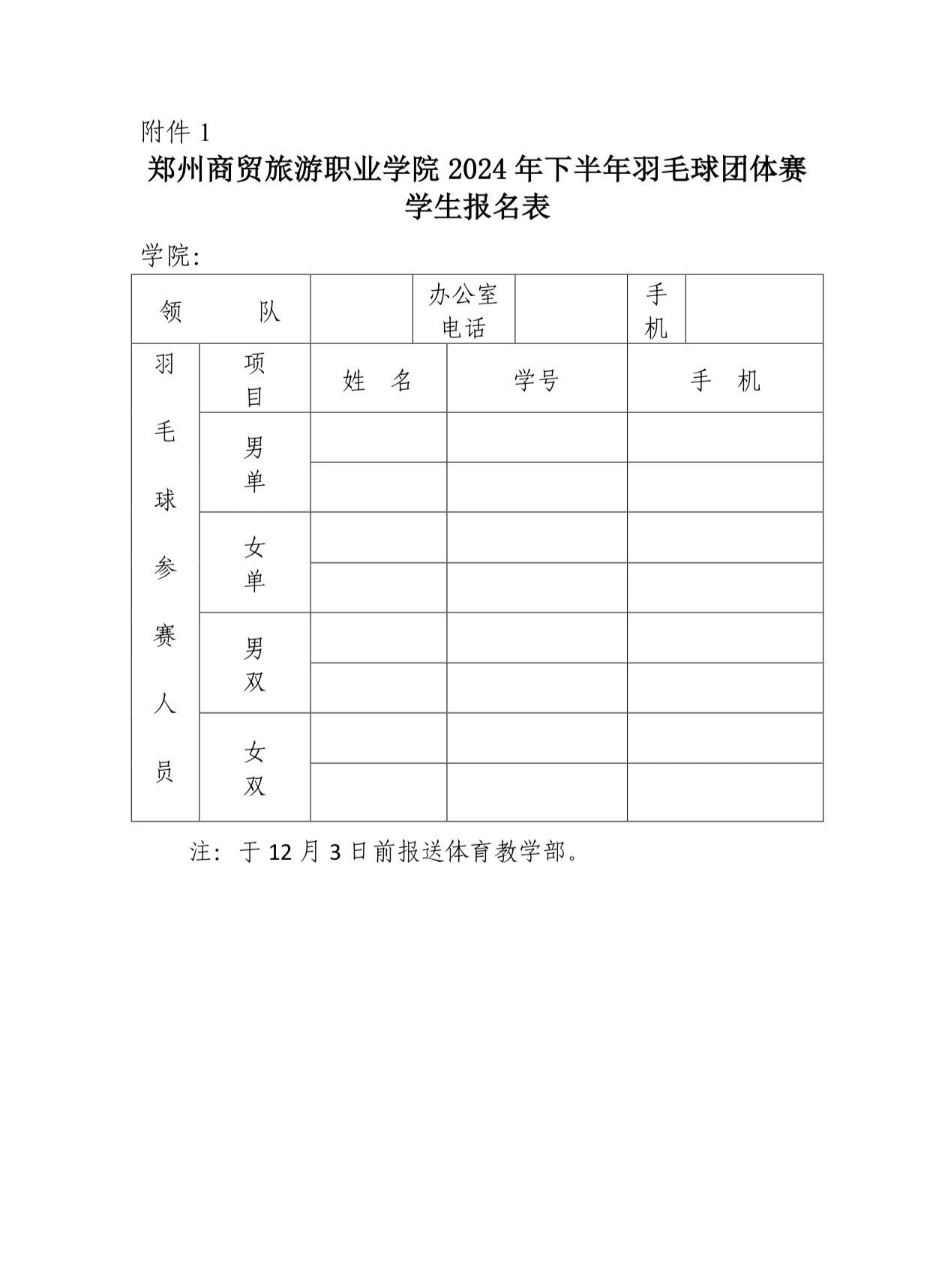 为贯彻落实党的教育方针,丰富校园文化生活,提高我校师生羽毛球运动技术水平,经研究决定,特举办郑州商贸旅游职业学院2024年第一届羽毛球比赛。现将比赛安排通知如下: