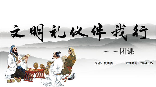 活动伊始,各团支部书记按照校团委统一发放的PPT开展《文明礼仪伴我行》专题宣讲,重点从课堂礼仪、校园礼仪两个方面号召同学们争做举止端庄、言行文明、讲究卫生、爱护公物、节约资源、礼貌待人的新时代青年。
