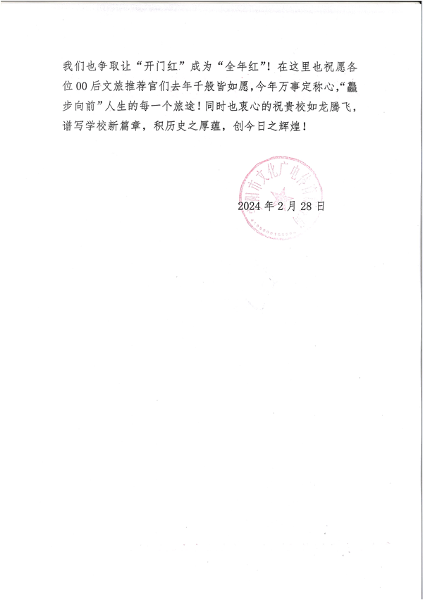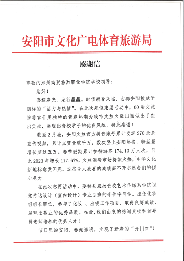 近日,安阳市文化广电体育旅游局给我校发来一封感谢信。对我校2023级视觉传达设计专业的李佳宇同学在寒假“返家乡”社会实践中做出的积极贡献,给予高度评价和诚挚地感谢。