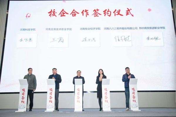 活动现场,为了促进产教融合深度合作,八六三软件与合作高校进行了签约授牌,我校校企合作办公室主任李万银上台代表签约。