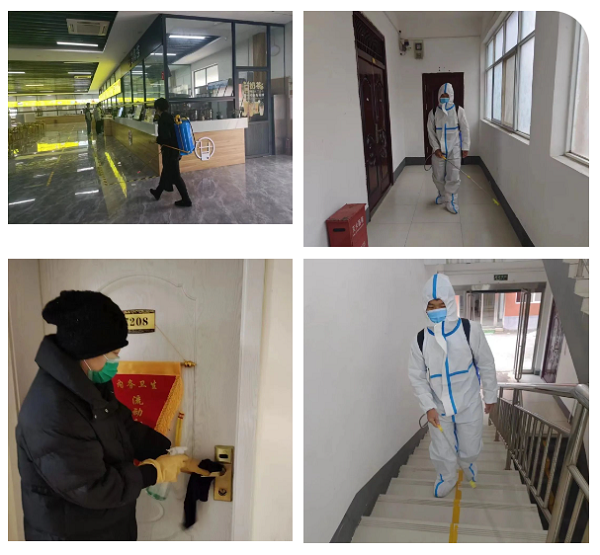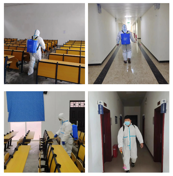 近几天,新密校区后勤处每天安排对教室、宿舍、办公楼、餐厅所有区域进行上下午各一次的消杀;餐厅早、中、晚各一次消杀。后勤处员工身背、手持喷雾器,走进各个宿舍、楼宇,严格按照卫生消毒管理的标准规范操作,根据不同场所按照不同规范要求进行消毒,教学楼、宿舍楼、办公楼等区域使用消毒器按照1000mg/L含氯消毒剂进行喷洒,不锈钢门、玻璃使用酒精进行喷洒半小时后,用洁净毛巾进行擦拭;餐厅、后厨使用次氯酸消毒液进行喷洒消毒,严格采用“地毯式”无死角的消杀方式,确保彻底消杀。