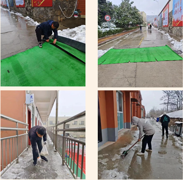 12月10日晚,我市迎来了今冬首场强降雪,飞扬的雪花给校园披上了银装,气温迅速下降,新密校区山地坡道道路面出现了大面积积雪结冰现象,为避免师生出行时发生意外,后勤处利用微信群温馨提示大家:冰冻、雨、雪天气应及时添加衣物,加强防寒保暖措施;雨雪天气出行要提高交通安全意识、注意安全防滑,避免摔倒受伤!并用纸箱壳、防滑垫等铺设结冰路面,对三、四号宿舍楼外部走廊撒盐化冰,预防师生滑倒摔伤。