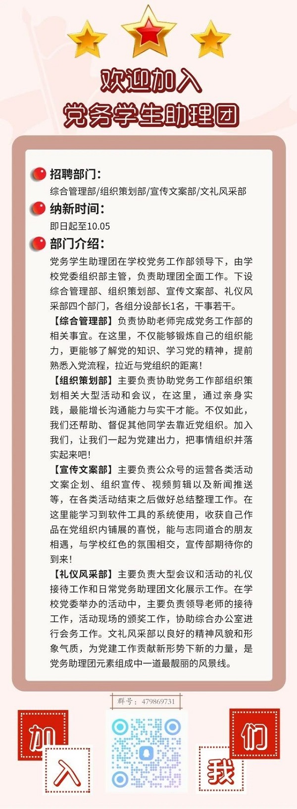 1.报名请加招新QQ群:479869731 (也可扫码加入,申请时请备注:专业+姓名)面试时间,地点会在群内实时通知;