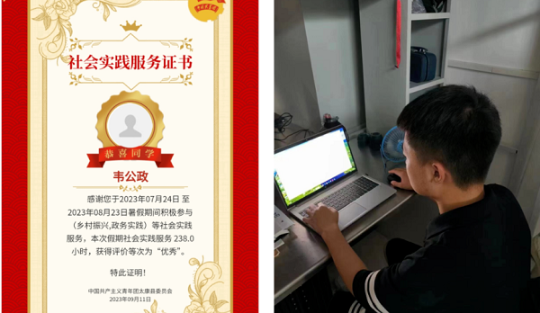 韦公政,2023年暑期参加了周口市太康县乡村振兴及政务实践活动,主要负责协助办事处工作人员整理表格、打印材料、上门走访调查、街道卫生打扫以及开展防溺水宣传等工作,亲身感受家乡发生巨大变化的同时,对家乡的发展有了更深入的了解。通过这次社会实践,他深切感受到了基层组织工作的辛苦,拓宽了自己的视野,并提升了社会责任感。