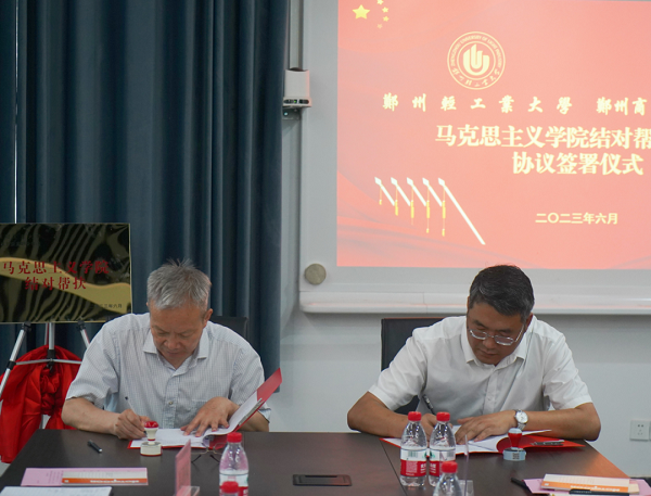签约仪式中,我校党委副书记、郑州轻工业大学马克思主义学院党总支书记马寒教授为结对帮扶揭牌,我校副校长、马克思主义学院院长冯鑫永教授与郑州轻工业大学马克思主义学院党总支书记马寒教授在结对帮扶协议书上签字。