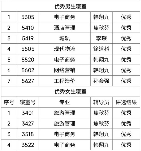 在此次活动中取得优秀文明寝室13个、优秀班级4个,分别是以下: