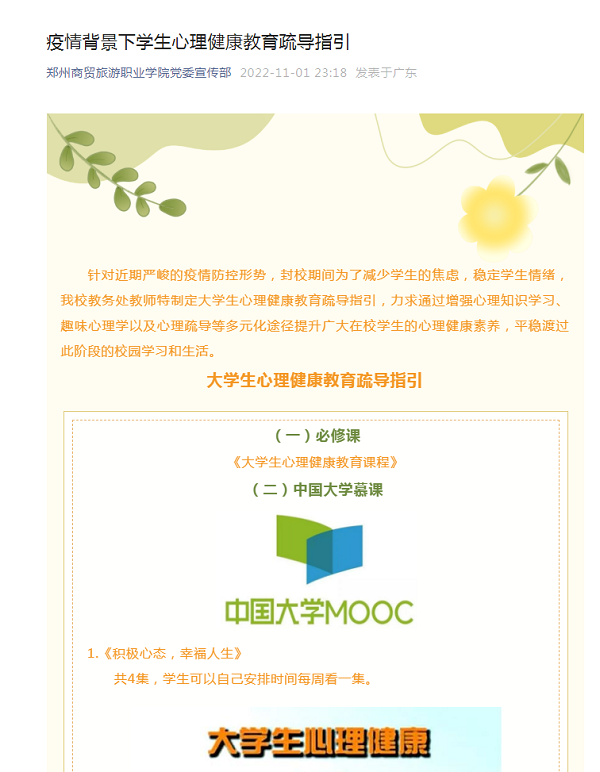 为缓解学生们的恐慌焦虑,学校成立疫情心理疏导专家组,抽调教务处基础教学部储云峰老师、彭白鸽老师分别担任专家组组长和副组长,邀请专家组老师进班进群,关注学生心理健康。学校教务处也特别制定《大学生心理健康教育疏导指引》,力求通过增强心理知识学习、趣味心理学以及心理疏导等多元化途径提升广大在校学生的心理健康素养,平稳渡过此阶段的校园学习和生活。请同学们相信,只要你们需要,老师们永远在你们身边,请对冲锋在第一线的工作人员、志愿者们给予包容,同时做到多沟通、多协调,不信谣、不传谣。
