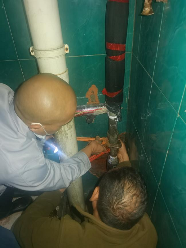 10月16号凌晨2点,值班人员巡查发现教学楼一楼东侧消防栓管道炸裂。我校后勤处黄家乐接到通知后,立即带领后勤处陈家鹏和郭文佳,以及范秀明、楚超鹏两位电工师傅前往现场进行抢修。与此同时,黄家乐还带领大家及时清除教学楼一楼走廊内积水,直至凌晨3点抢修完成,避免了事故的发生。