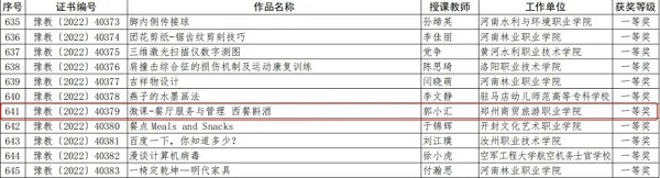 近日,河南省教育厅办公室发布《关于公布河南省第二十六届教育教学信息化交流活动评选结果的通知》,我校郭小汇老师的《微课-餐厅服务与管理 西餐斟酒》作品从全省各单位推荐的作品中脱颖而出,荣获一等奖。