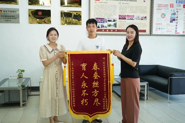 学生感恩送锦旗,师生情谊暖人心。2022年7月21日,郑州商贸旅游职业学院退役军人学院2019级毕业生罗俊祥、解连鹏满怀感恩之心,把绣有“师恩化春雨润物细无声”“春蚕丝方尽,育人永不休”“授教固有方,桃李满天下”三面锦旗送到了退役军人学院,以此表达感谢学校、感谢老师的培育和关爱之情。