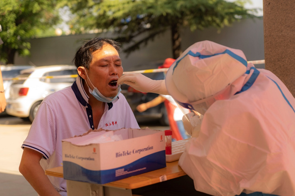 全体人员积极配合,在检测时按序进出,保持两米安全间隔,核酸采样过程高效快捷。