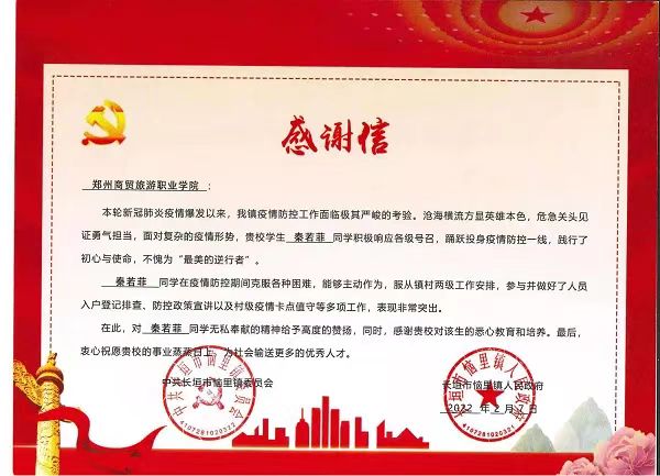 中共长恒市恼里镇委员会向我校发来感谢信,感谢我校2021级现代物流管理专业秦若菲同学在疫情防控期间克服各种困难,能够主动作为,服从镇村两级工作安排,参与并做好人员入户登记排查、防控政策宣讲以及村级疫情卡点值守等多项工作,对秦若菲同学无私奉献的精神给予高度的赞扬。